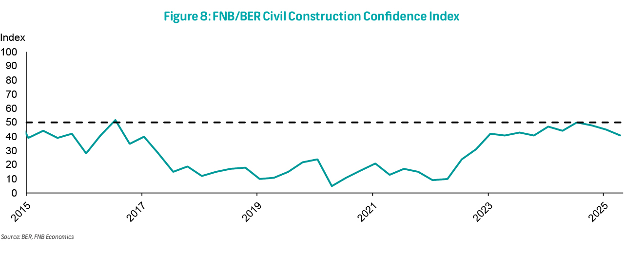 Also on Tuesday, the FNB/BER Civil Confidence Index for 3Q25 will be published. The Index fell for the third consecutive quarter in 2Q25, dropping to 41 from 45 previously. This decline in sentiment occurred despite signs of improved construction activity and profitability, with employment also showing gains.
