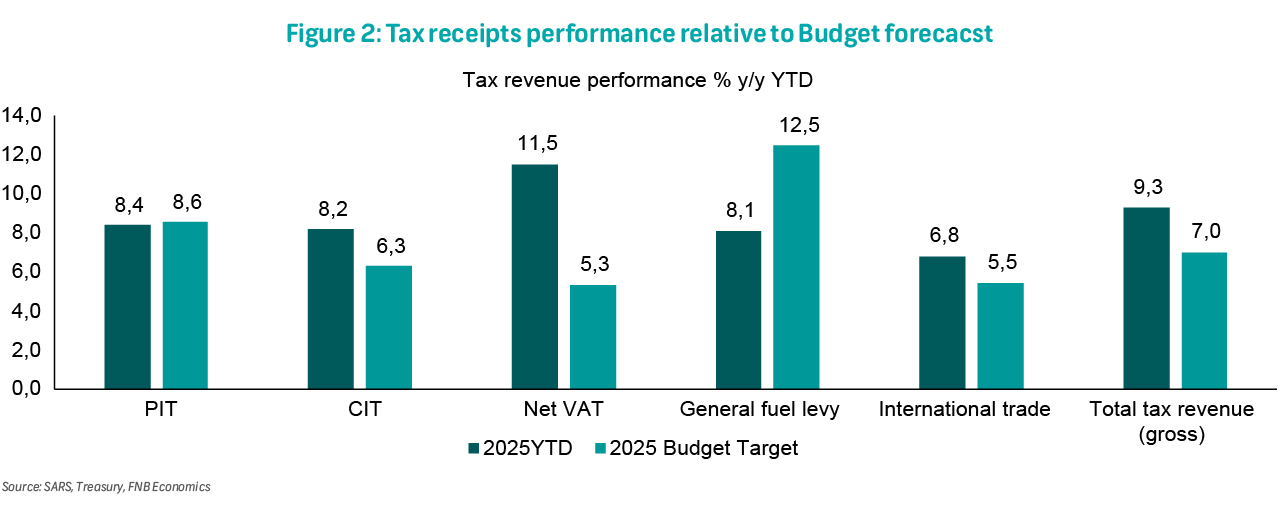 While economic growth may fall short of the 2025 Budget projections, fiscal revenue outcomes have been mixed, with some categories outperforming expectations while others are underperforming. Gross tax revenue has increased by 9.3% y/y in the fiscal year-to-date (YTD), ahead of the Budget's full-year projection of 7.0%. Among major revenue components (approximately 90% of gross revenue):