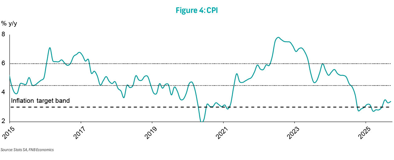 The Quarterly Labour Force Survey (QLFS), a household-based employment survey (not seasonally adjusted), reflected an increase in total employment of 248 000 q/q in 3Q25, following an increase of 19 236 in the previous quarter. Compared to the same quarter last year, employment improved by 109 000 to 17 055 000. The level of unemployment declined by 360 000 q/q (3 000 y/y), bringing the total number of unemployed individuals to 8 007 000. As a result, the official unemployment rate fell by 1.3ppts to 31.9%. The combined rate of unemployment and the potential labour force declined to 42.4% in the 2Q25, from 43.0% in the previous quarter. Despite this modest improvement, the persistently high unemployment rate highlights the ongoing vulnerability and weakness of the labour market. This challenge is further exacerbated by increased uncertainty about the potential employment effects of US tariffs on key sectors such as agriculture, automotive, machinery and equipment manufacturing, and mining (excluding critical mineral producers). Over the medium term, sustained structural reforms and accelerated efforts to diversify export markets will be crucial to support job creation and strengthen labour market resilience.