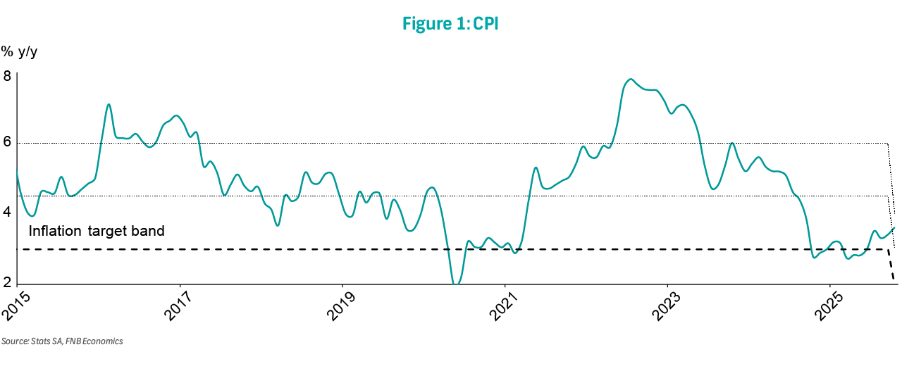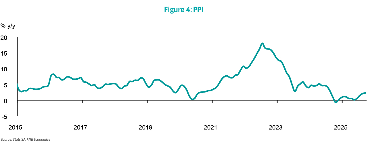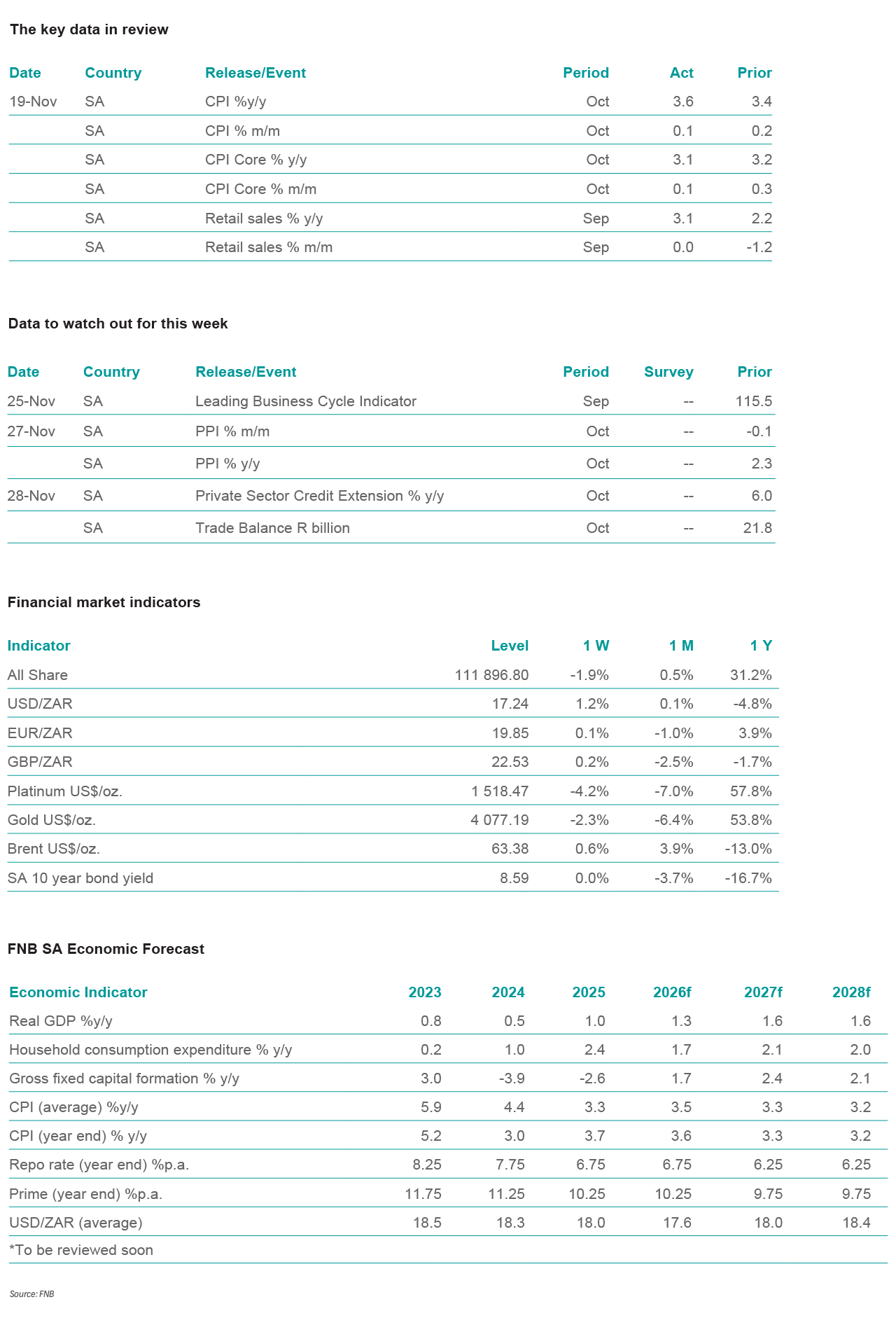 Headline inflation was recorded at 3.6% y/y in October, up from 3.4% in September. Monthly pressure was 0.1% driven by rising services costs. Core inflation was 0.1% m/m and 3.1% y/y, down from 3.2% previously. Services inflation recorded 0.2% m/m and 4.0% y/y. Core goods inflation was -0.1% m/m and 1.0% y/y. Average fuel prices rose by 0.1% m/m and were 3.3% higher than at the same time last year. Food and non-alcoholic beverages (NAB) inflation recorded 3.9% y/y, down from 4.5% previously, supported downwards by contracting vegetable prices. We see the November headline inflation print at 0.1% m/m and 3.7% y/y; however, food and NAB inflation present risks to this expectation. Ultimately, headline inflation is expected to stay below 4% over the next year, comfortably within the tolerance band, before easing toward 3% in the medium term.