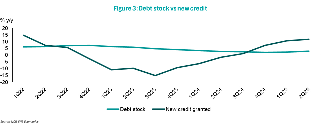 The credit market showed strong momentum in 2Q25, with new credit up 11.7% y/y to R156.1 billion, however, the debt stock rose only 2.8%, signalling deleveraging and debt restructuring. South African Reserve Banks (SARB) data confirms that this trend persists, with household credit growth averaging 2.9% in 3Q25. Below we examine National Credit Regulator (NCR) data to explain these divergent trends.
