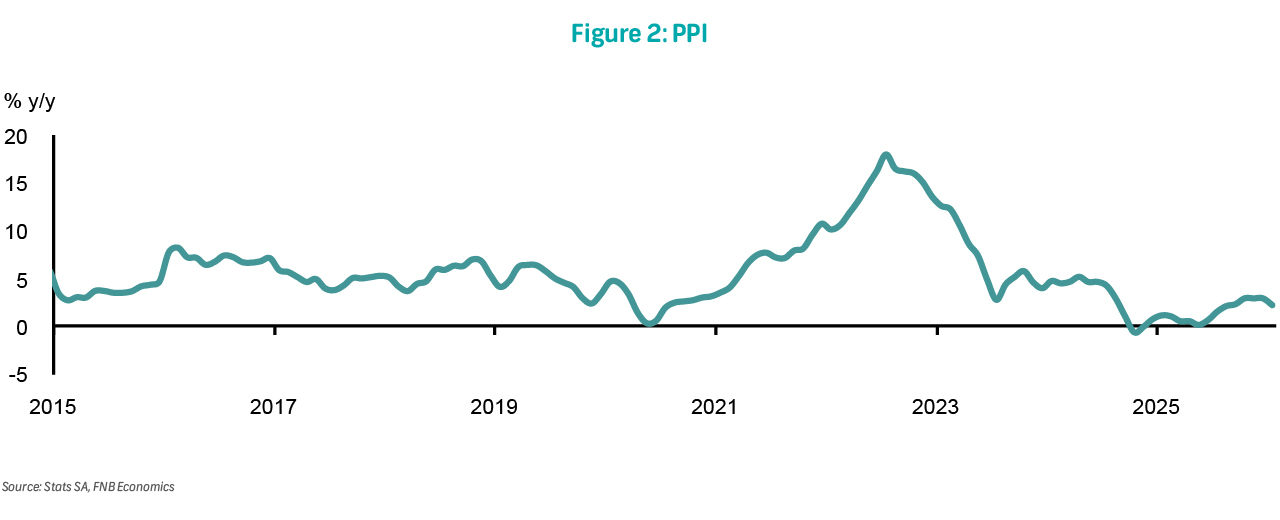 Producer inflation slowed to 2.2% in January, from 2.9% in December. Month-on month (m/m), producer prices declined by 0.2%, reflecting a fall in food and fuel prices. Food prices declined by 0.4% m/m, underscoring a 5.4% monthly drop in meat prices. We expect producer inflation to have remained muted around the 2.0% handle in February, supported by a resilient rand and lower fuel prices.