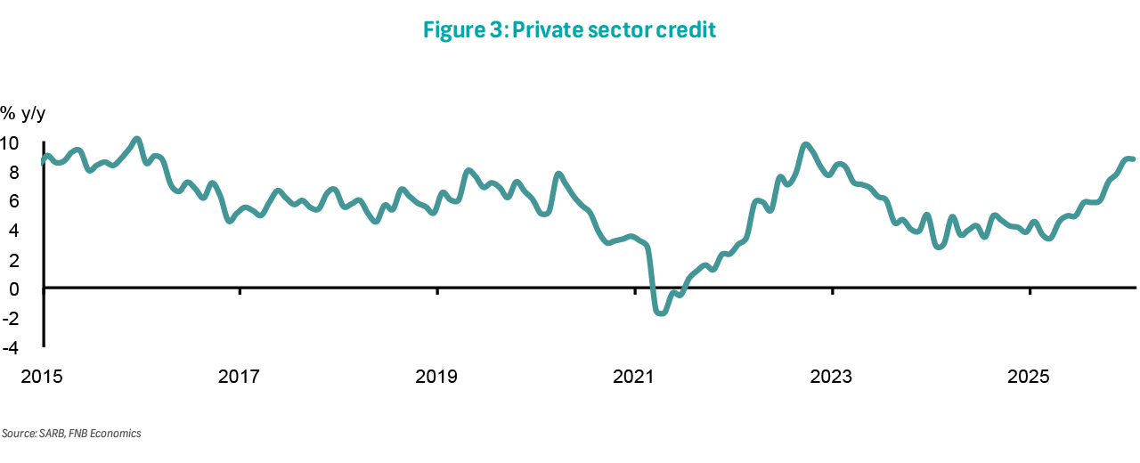Private Sector Credit Extension (PSCE) growth edged up to 8.8% y/y in January, from 8.7% in December. Corporate credit growth remained robust at 12.9% y/y, unchanged from the previous month. Meanwhile, household credit growth continued its gradual acceleration, rising to 4.0% y/y from 3.7%. This marks the strongest pace since February 2024 (4.3%). Within household credit, general loans and advances increased to 2.8% y/y (from 2.2% in December), vehicle asset finance accelerated to 8.9% (from 8.1%), and mortgage advances edged up to 2.8% (from 2.6%). On the corporate side, general loans and advances remained the key driver, expanding by a still-strong 15.6% y/y, albeit slightly softer than December's 16.2%. Corporate vehicle asset finance moderated to 6.9% (from 7.4%), while mortgage advances eased marginally to 6.4% after holding at 6.6% in November and December. Overall, corporate credit growth remains firm, while household credit is gradually gaining traction. We expect financial conditions to remain broadly supportive over the medium term, underpinned by lower borrowing costs and an anticipated improvement in macroeconomic conditions.