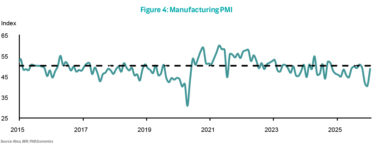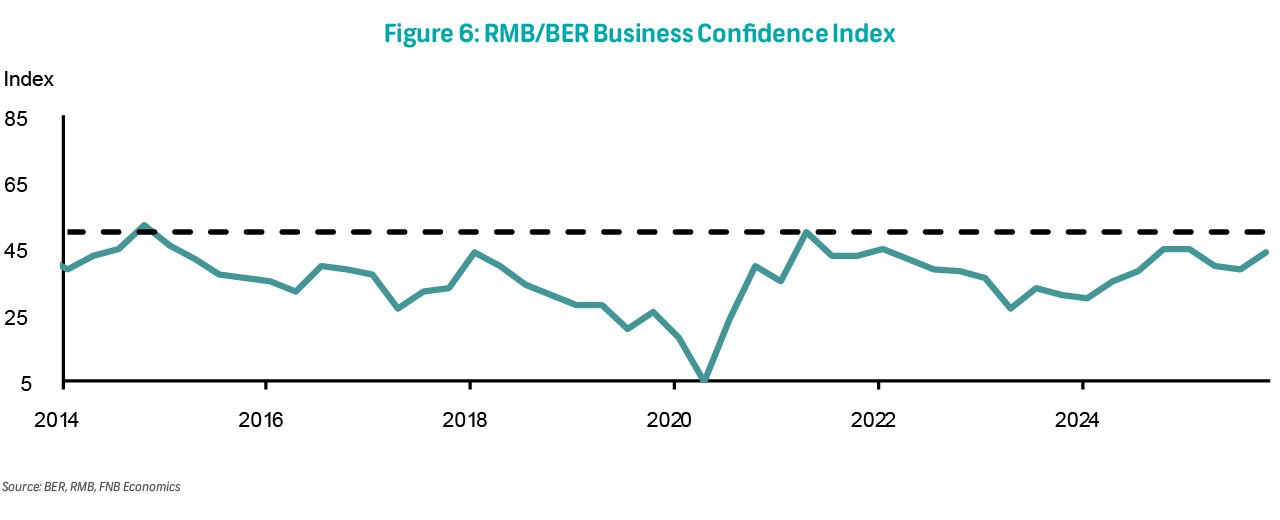 On Wednesday, the RMB/BER Confidence Index (BCI) for 1Q26 will be published. In 4Q25, the BCI rose to 44 index points, up from 39 previously. While the composite index showed a positive shift, this again masked pronounced sector-level movements. The survey period followed the South African Reserve Bank's rate cut and its shift toward a lower inflation target, which provided some relief to businesses. However, the lingering effects of earlier export tariffs and subdued global growth continued to weigh on the outlook, particularly for sectors exposed to international markets.