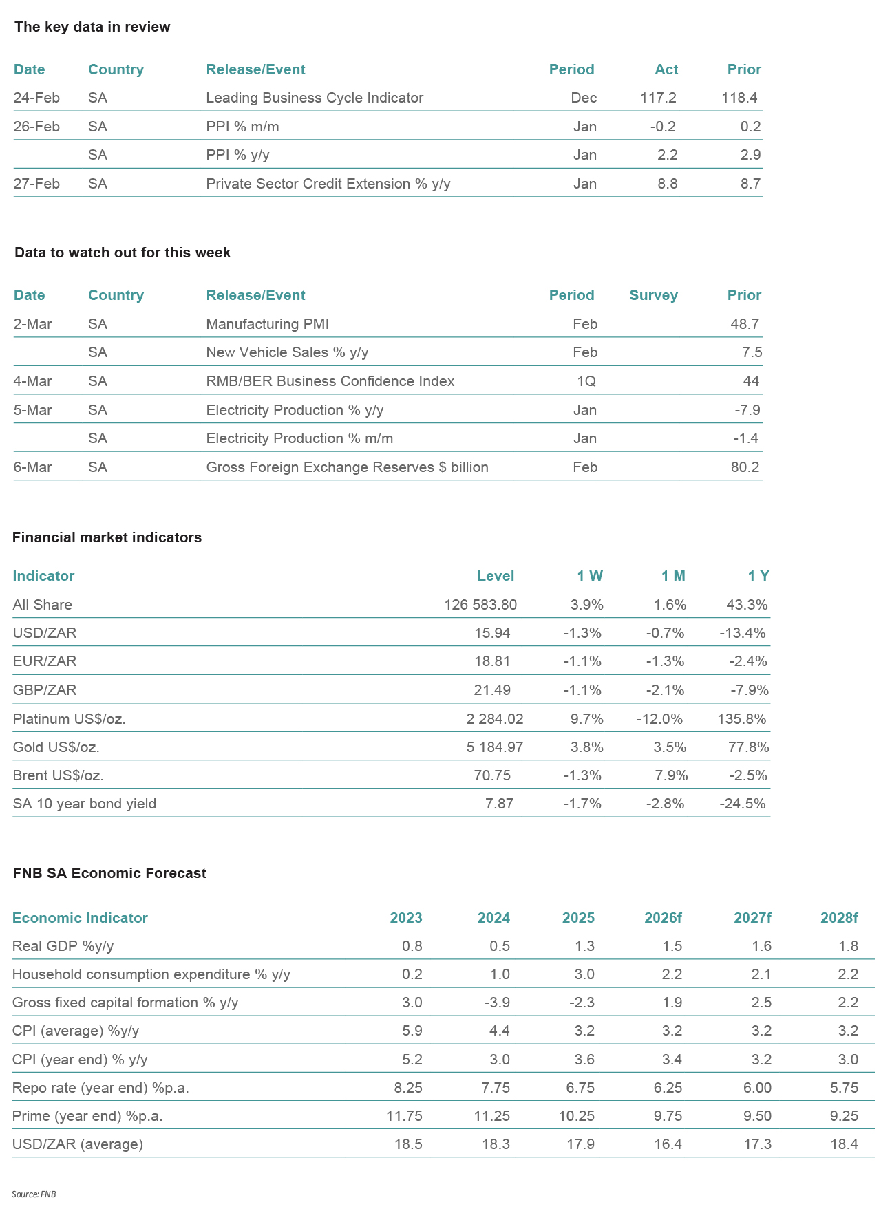 On Monday, manufacturing PMI I data for February will be released. The manufacturing PMI (seasonally adjusted) increased to 48.7 in January, remaining in contractionary territory. The increase was driven mainly by a rebound in business activity and new domestic sales orders, alongside a normalisation in inventories and some recovery in employment. However, exports remained a drag due to the stronger rand.