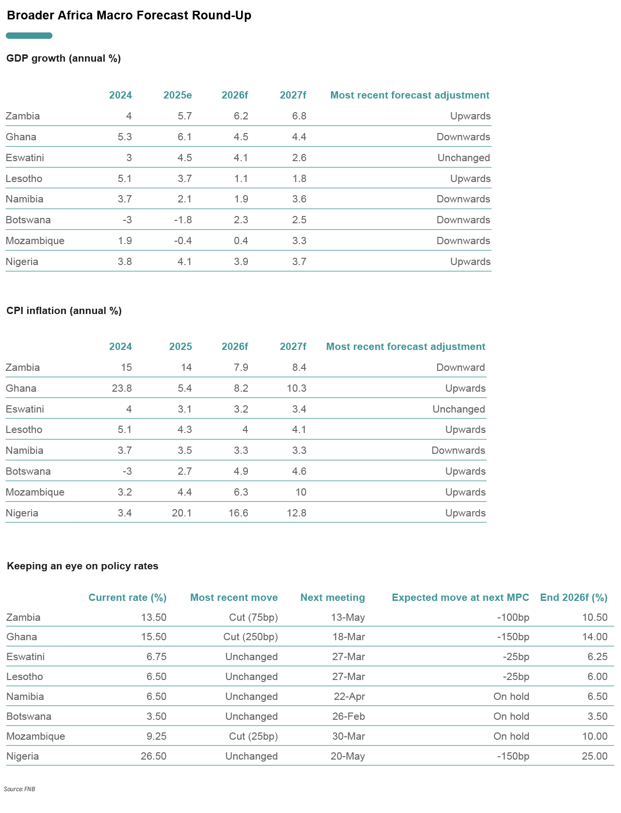 FirstRand Group has a presence in several other African countries and conducts extensive research into these economies. As part of our thought leadership, we will include our views on Botswana, Eswatini, Ghana, Lesotho, Mozambique, Namibia, Nigeria, and Zambia in this publication. Below is a summary of our medium-term outlook, where most countries are undergoing broad macroeconomic rebalancing. As structural reforms and fiscal consolidation improve, the operating environment and crowd-in private sector participation, asset and currency valuations should be supported, and inflation should remain within a comfortable range. This should allow monetary policy neutrality and uphold conducive financial conditions. That said, we worry about the adverse risks presented by ongoing geopolitical and trade tensions, destructive weather conditions, as well as political uncertainty and policy execution failures.