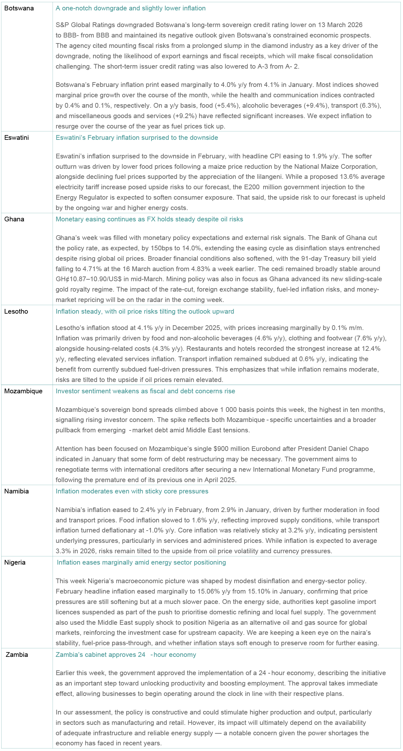 The South African Reserve Bank's (SARB) Monetary Policy Committee (MPC) will announce its second interest rate decision for 2026 on Thursday, 26 March. While there was a split on whether they would cut interest rates or leave them unchanged at the January meeting because expected inflation provided ample space for continued easing, the market was less split on expectations of a cut in March. This was before the war that is currently raging through the Middle East. Since then, the degree of uncertainty around the inflation trajectory has risen, and a conservative MPC may not want to make further moves downward during these volatile times. We remain constructive on the South African (SA) economy's outlook, but we are confronting an inflation shock that is likely to reverberate across the entire economy and sustain shifts in expectations.
