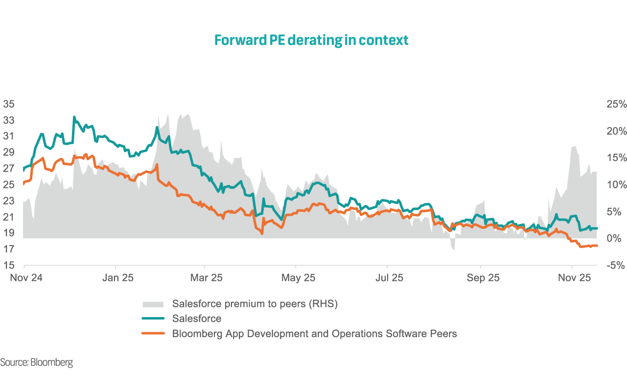 Salesforce is trading on a forward PE of 19.6 times, a slight discount relative to its long-term history.