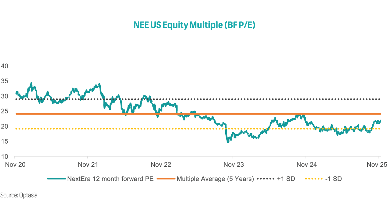 NextEra is a leading energy company specialising in electric power and energy infrastructure development. The company's portfolio includes natural gas, nuclear and renewable energy, including industry leading wind and solar power and battery storage. The group's core businesses include Florida Power & Light Company (FPL), America's largest electric utility by retail electricity produced and sold, and NextEra Energy Resources (NEER), a major developer of energy infrastructure with 20% share of the US renewables market. This dual structure gives it both stable cash flows from regulated operations and high growth potential from renewables.