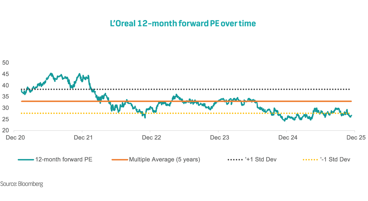 L'Oreal's valuation remains at a premium to the sector, reflecting its unrivalled scale, innovation, and brand equity, as well as its consistent ability to compound growth and defend margins through pricing power and mix improvement. The stock's valuation relative to its own history remains depressed, however.