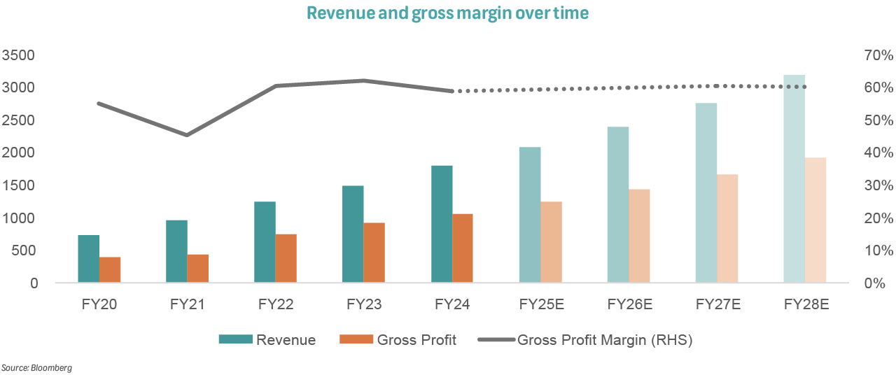 Birkenstock listed in October 2023, which means we have limited financial information related to years earlier than 2021 (from where disclosure was provided prior to listing). Between 2021 and 2024, the company grew revenue by 23.3% on a compounded annual growth rate (CAGR) basis, reaching revenue of €1.8 billion in its year ended 30 September 2024. The market anticipates a slight tempering of growth over the next four years to ~15% per annum.
