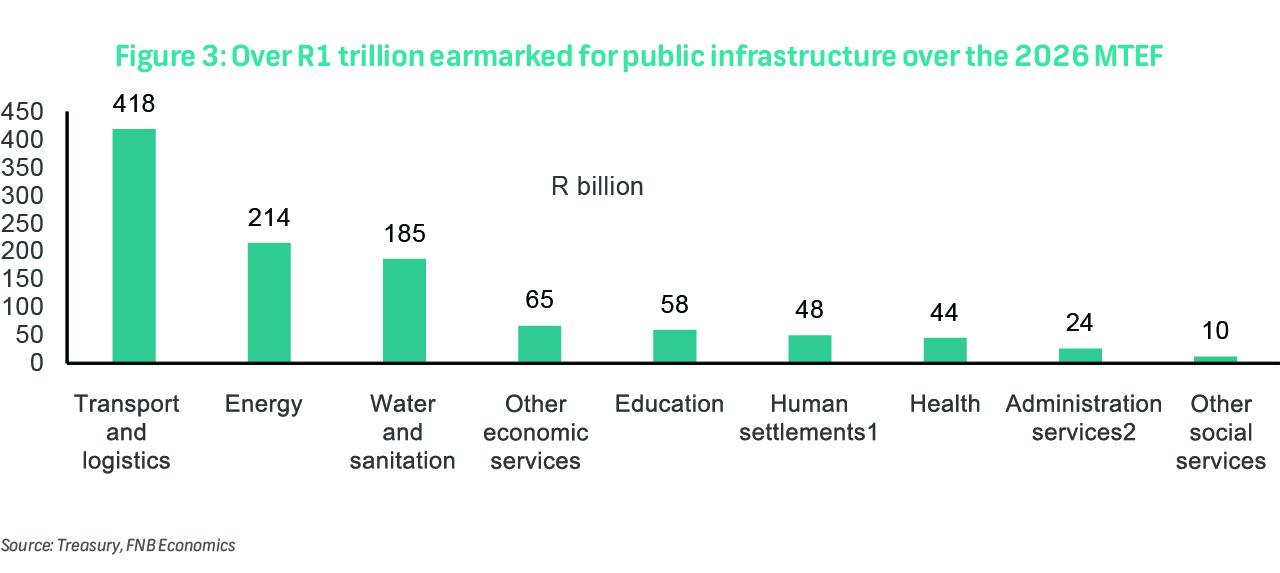 Investment in public infrastructure remains a fundamental priority to stimulate economic growth and improve public services. It is fundamental to long-term economic growth service delivery, job creation and climate resilience. Planned infrastructure expenditure over the next three fiscal years amounts to R1.07 trillion, with significant funding allocated to transport and logistics, energy and water projects to remove growth constraints (Figure 3).