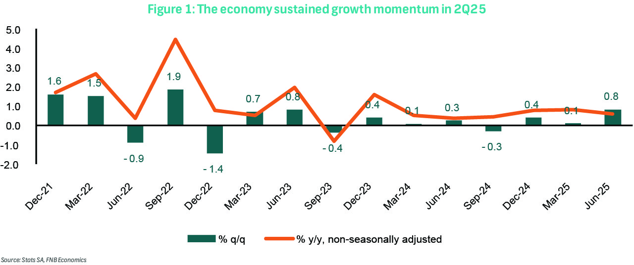 Real GDP (not seasonally adjusted) grew by 0.6% y/y in 2Q25 (versus our 0.7% expectation), following increases of 0.8% y/y in both 1Q25 and 4Q24. On a seasonally adjusted (non-annualised) basis, the economy expanded by 0.8% q/q, sustaining momentum after the 0.1% rise in the previous quarter. This outcome was 0.3-percentage points (ppts) above both our forecast and the Reuters consensus of 0.5% q/q.