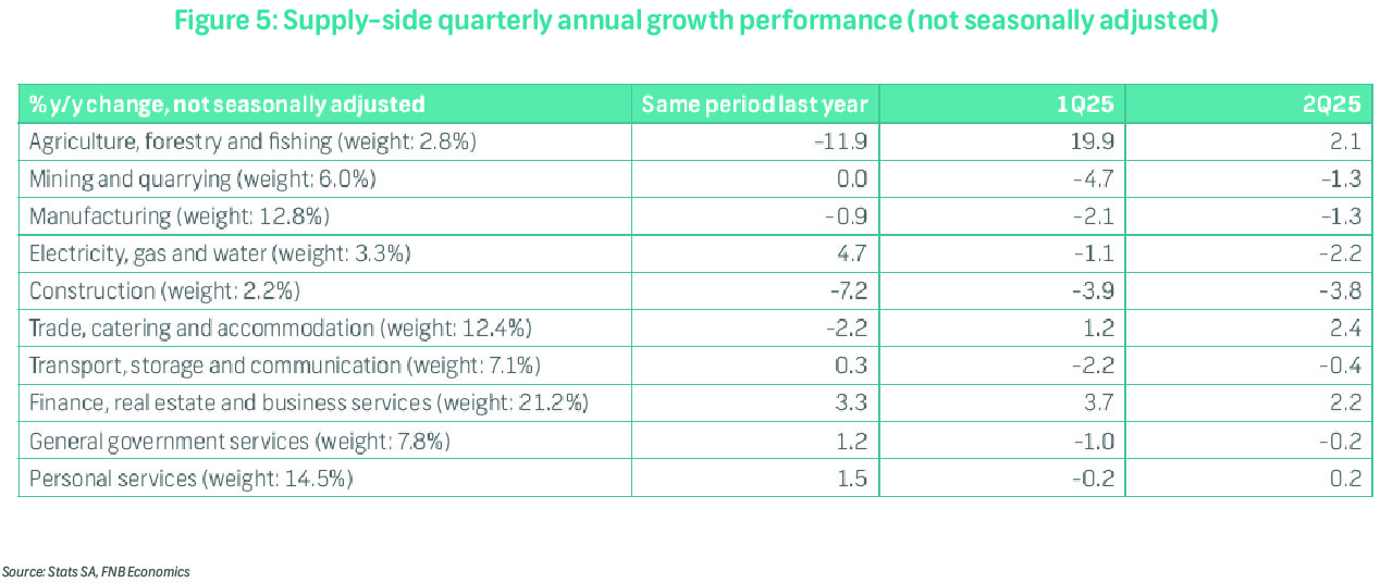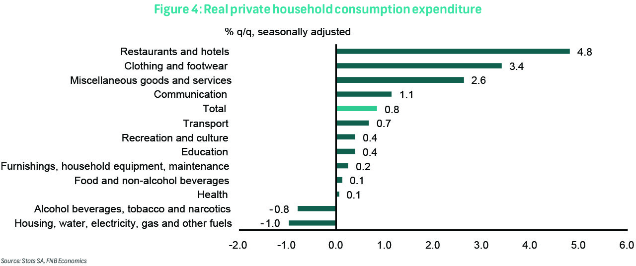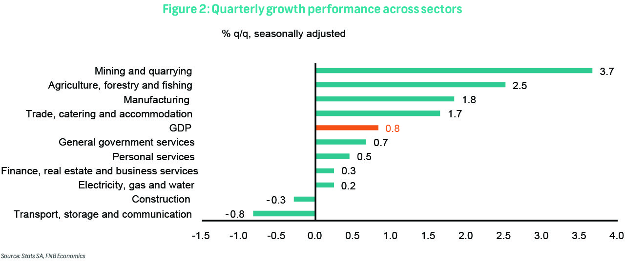 Mining, manufacturing, as well as the trade, catering, and accommodation sectors, each contributed 0.2ppts to quarterly GDP growth, with q/q growth of 3.7%, 1.8%, and 1.7%, respectively. Mining gains were led by PGMs, gold, and chromium ore; manufacturing by petroleum-related products, motor vehicles, parts and accessories, and other transport equipment; and trade, catering, and accommodation by retail (+0.9%), motor trade (+0.6%), accommodation (+4.1% nominal), as well as food and beverages (+2.7%).