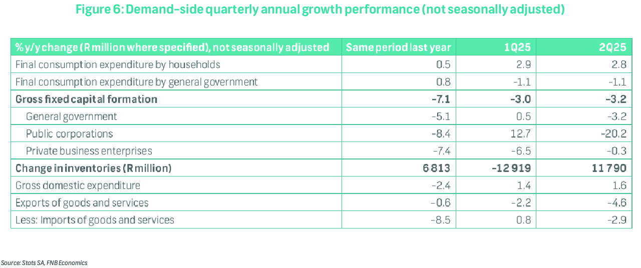 Gross capital formation rose 2.2% q/q, reflecting inventory restocking of R16.6 billion (annualised) following a R6.7 billion destocking in the prior quarter, contributing 0.5ppts. However, gross fixed capital formation (i.e., investment in long-term productive assets) declined 1.4% q/q, largely due to a 33.5% drop in public corporation investment and a 3.4% fall in government investment. Private business enterprise investment rose 5.6% q/q, despite subdued confidence, policy uncertainty, and weak demand, though it remains down 0.3% y/y after a 6.5% fall in 1Q25. While the rebound is encouraging, the year-to-date decline of 3.4% suggests our forecast for a mild contraction may need downward revision, though annual GDP growth is unlikely to be affected given the strong performance in other components.