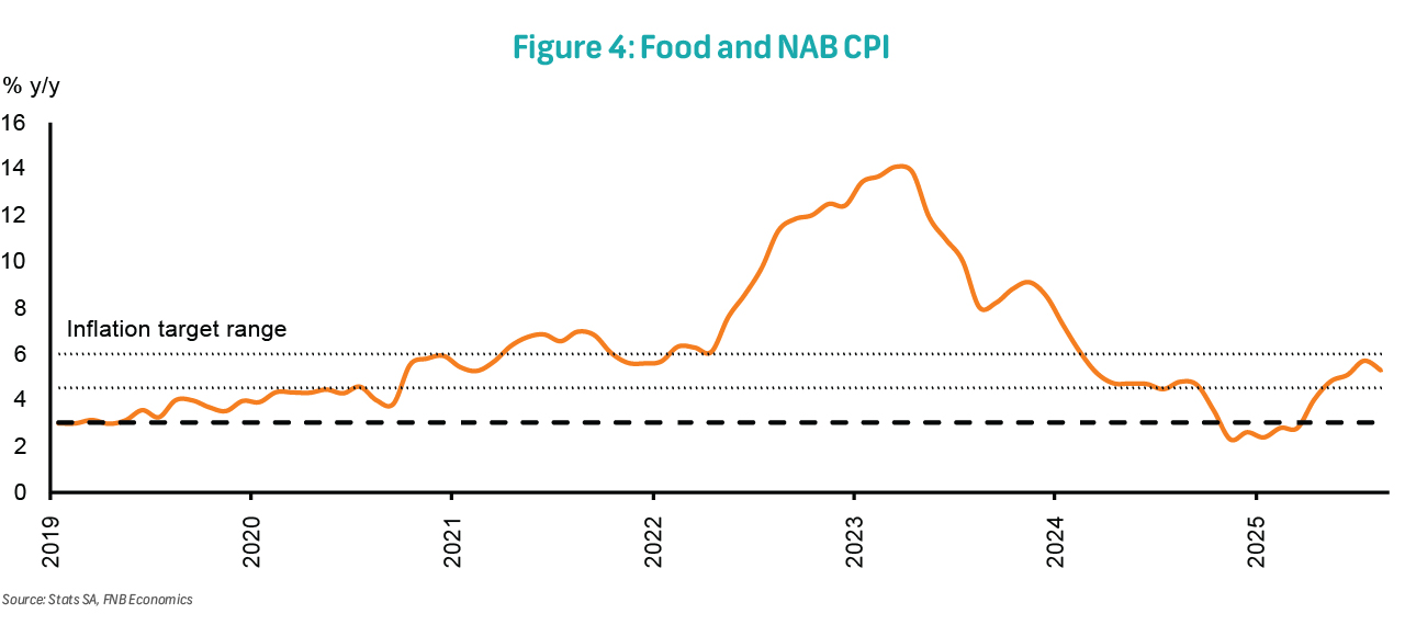 The 3Q25 inflation expectations survey reflected further slowing over the various time horizons. Importantly, over the two-year monetary policy implementation horizon, expectations have softened from 4.5% to 4.2%. Meanwhile, longer-term expectations are at their lowest since 2011, recording 4.2% from 4.4% previously. Nevertheless, this slowing was driven by analyst expectations, which trend towards the Monetary Policy Committee's (MPC) 3% objective, while business and labour unions remain anchored above 4%. This highlights some rigidity in shifting towards the new de facto target by price setters. Furthermore, any hesitance by government to officially support the lower target may affect the credibility and efficacy of the adjustment process. Fortunately, oil prices are expected to remain soft while other import costs should be contained by the influence of cheaper products from the East as well as a resilient rand. This will assist with managing headline inflation, while restrictive monetary policy keeps core inflation muted.