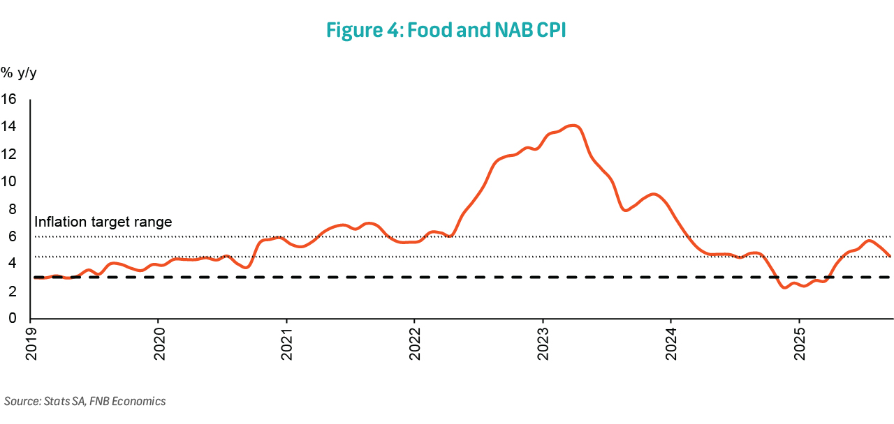 Food and NAB inflation recorded 4.5% y/y, down from 5.2% previously. Monthly deflation persisted, recording 0.2% in September, which primarily reflected deflation in fresh produce that outweighed meat and cereals inflation.