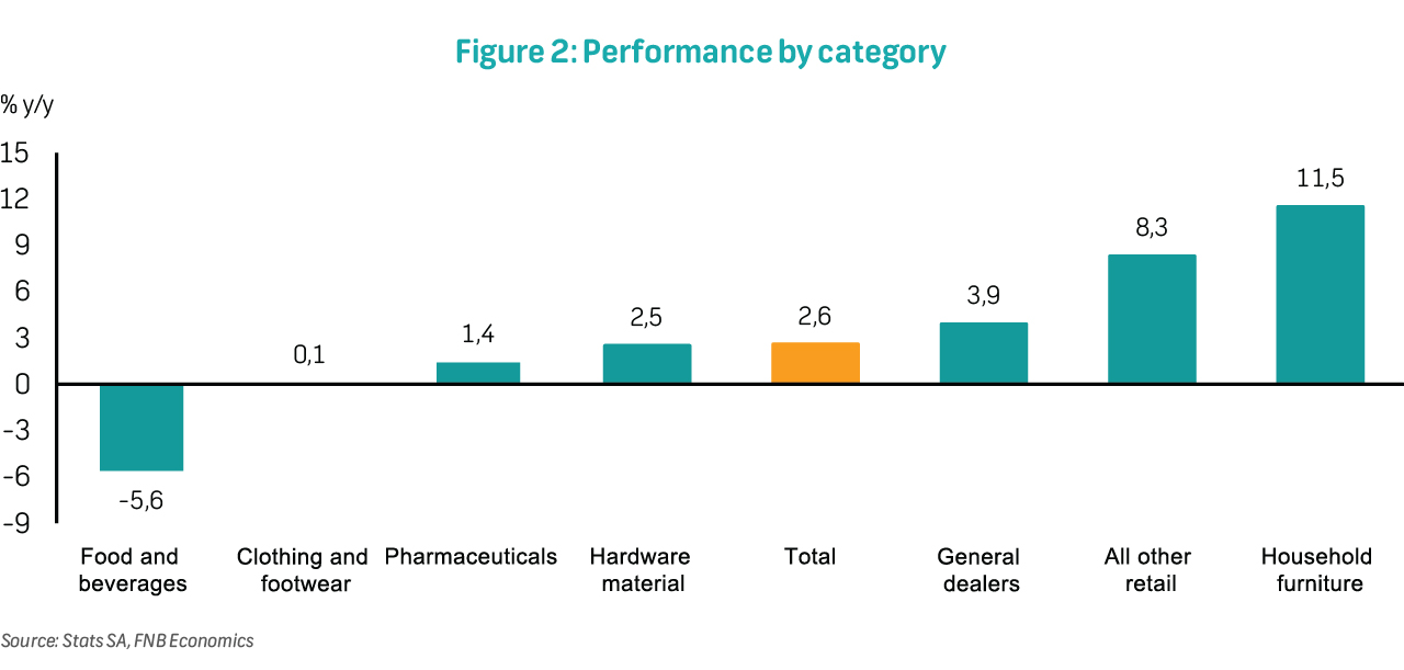 Growth in December was once again broad-based across most segments, with all categories except specialist food and beverage retailers recording an expansion. The latter declined sharply by 5.6% y/y, detracting 0.5-percentage points (ppts) from headline growth.