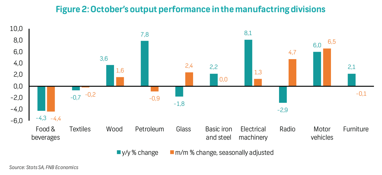 Growth in manufacturing output in October reflected an increase in six out of ten manufacturing divisions. Amongst the major divisions, the petroleum, chemical products, rubber and plastic products division expanded by 7.8% y/y, reflecting an increase from a 6.5% y/y expansion in September. The motor vehicles, parts and accessories and other transport equipment division expanded by 6.0% y/y, rebounding from a sharp 19.7% y/y decline in the prior month. Within this division, motor vehicles increased strongly by 34.1% y/y, following a contraction by 16.7% y/y in September. Meanwhile, parts and accessories declined by 2.7% y/y, and other transport equipment declined by 7.1% y/y. The wood and wood products, paper, publishing and printing division expanded by 3.6% y/y, after falling by 2.5% y/y; basic iron and steel, non-ferrous metal products, metal products and machinery division expanded by 2.2% y/y, reflecting an acceleration from the 1.4% y/y expansion in the previous month. In contrast, the food and beverages division declined by 4.3% y/y, marking the fourth month of decline.