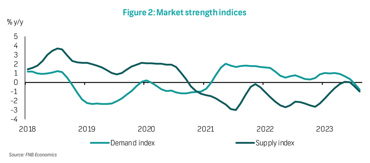 The FNB House Price Index growth slowed to 0.6% y/y in September, down from 0.8% in August (Figure 1). This takes average house price growth to 0.9% in 3Q23, down from 2.1% in 2Q23. Our internally developed market strength index continues to show declining levels of demand, while the supply of properties for sale also declined in August (Figure 2). Feedback from our latest Estate Agents Survey suggests that two-thirds (67%) of listed properties now take three months or more to sell, up from 56% in 2Q23. As such, we expect a low house price growth trajectory to continue in the next few months, until inflation and borrowing costs ease more meaningfully in 2H24. Year-to-date (January to August), house price appreciation averages 1.8%, versus 3.5% in 2022 and our prediction of a 1.7% average for 2023.