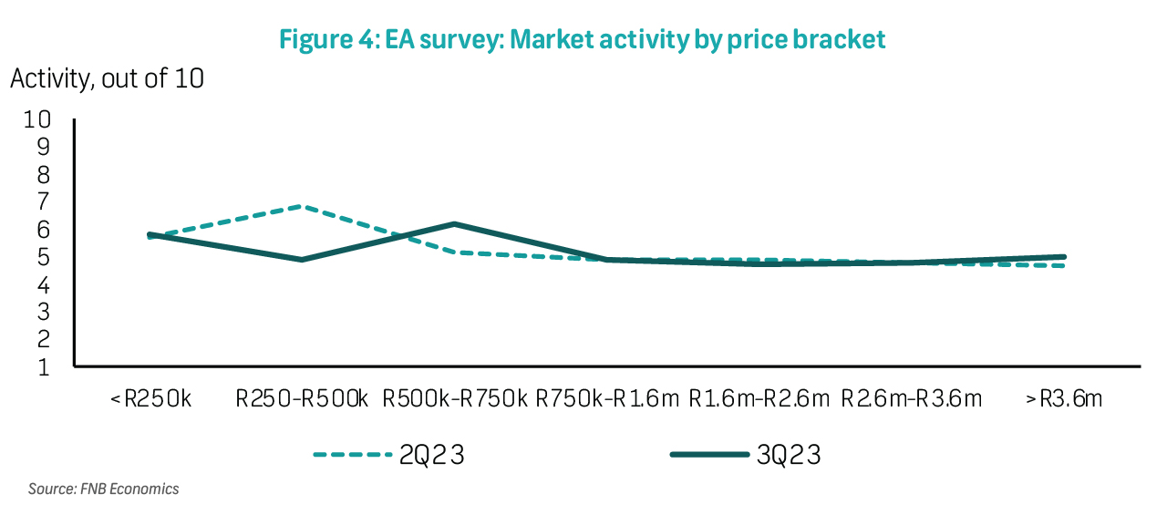 Market activity moved sideways and recorded a rating of 5.1 (out of 10) in 3Q23. At this level, agent activity rating remains below the long-term average of 5.9 (since the inception of the survey in 2004), and considerably (28.2%) lower than the most recent peak of 7.1 recorded in 4Q20. Indeed, year-to-date (January to June), National Credit Regulator (NCR) data shows that the volume of new mortgage transactions has declined by 18%. Compared to 4Q21, at the onset of the current interest rate hiking cycle, mortgage transactions have declined by approximately 24% (see our mortgage market analysis here). Nevertheless, the extent of the decline in activity has been relatively shallow compared to the global financial crisis period (Figure 3). By region, the Western Cape recorded higher activity at 5.9, still lower than last quarter's 6.2 rating. Activity in Gauteng saw a further decline in 3Q23, from 4.5 to 4.3, the lowest rating across all the regions. In KwaZulu-Natal, activity was unchanged at 5.2, while the Eastern Cape slipped to 5.4 from 5.7 in 2Q23. By price, the R500k-R750k bracket was the best performer, with a rating of 6.2, down from 6.9 previously (Figure 4). Higher activity in lower priced segments is supported by the downscaling trend amid heightened financial pressure, with homeowners across income groups searching for cheaper alternatives.