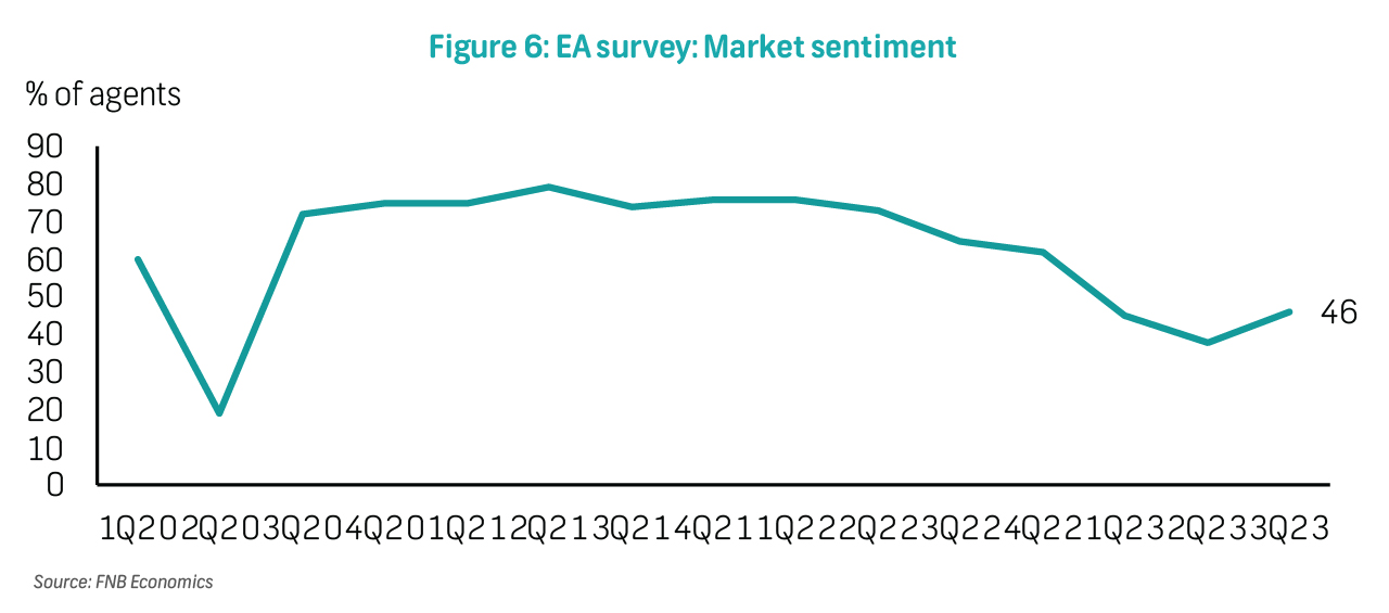 The results suggest that the average time that properties are on the market for sale has shortened marginally to 11 weeks and five days (82 days), compared to 85 days 2Q23. The slight improvement was likely due to less severe load- shedding disruptions in the quarter. Overall, agents estimate that two-thirds (67%) of properties on the market for sale now take three months or longer to sell, an increase from a third (33%) in 1Q22. While these factors would have weighed on estate agent sentiment in 3Q23, this was counteracted by better-than-expected load-shedding disruptions as well as expectations of a peak in interest rates. As a result, the proportion of estate agents who are satisfied with current market conditions, increased from 38% from 46% in 3Q23, and still reflects broadly weak market enthusiasm (Figure 6).