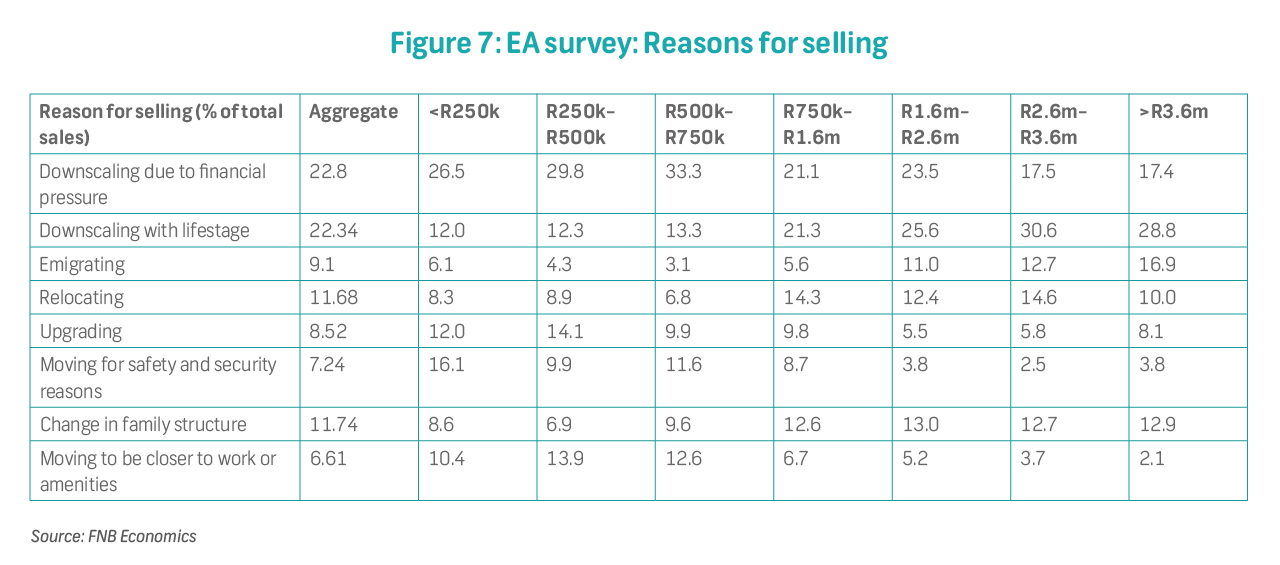 Reasons for selling: financial pressure-induced sales remain elevated at 23% of total volumes in 3Q23, relatively unchanged from the previous quarter but higher than the historical average of 18% since 4Q07. As expected, these are disproportionately higher in the affordable market segment, with an estimated 30% of sales attributed to financial pressure. This reflects the impact of the sharp increase in debt servicing costs, which should have a more pronounced impact on lower-income households. Sales attributed to relocation within SA appear to be plateauing, from 14% in 3Q22 to 12% in 3Q23, following an increase from 8% in 1Q20. Incidents of upgrading have slowed considerably since the beginning of the tightening cycle, from 15% in 4Q21 to 9% in 3Q23. Emigration-related sales were steady at 9%, significantly lower than the peak of 18% observed in 2019. However, these remain elevated in higher-priced segments, particularly the R3.6m bracket (Figure 7). By age, the 35-44 group make up 63% of those believed to be selling due to emigration.