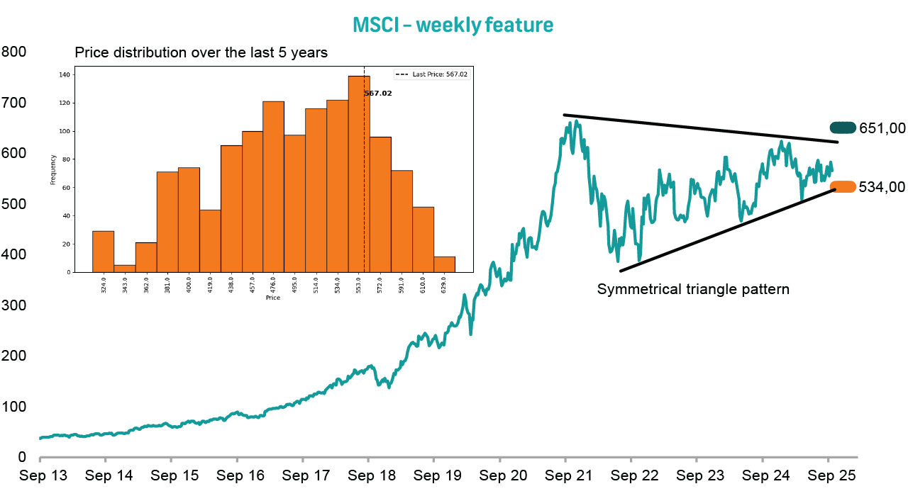 Technically, the formation of a symmetrical triangle, coupled with the potential for an upside breakout that aligns with prevailing market momentum, strengthens the bullish outlook and presents a promising investment opportunity (see the converging black trendlines on the main chart). This pattern can signal a period of consolidation where buying and selling pressure gradually converge, pointing to upside price potential and supporting a bullish case. As the range narrows, it often reflects accumulation ahead of a decisive breakout. A breakout to the upside confirms renewed bullish momentum.