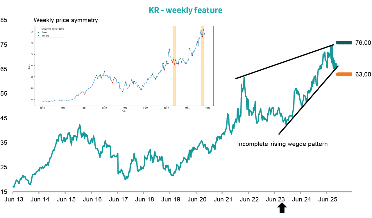 The recurring symmetry periods mark consolidations that often precede upward moves and the current higher trough near support supports a bullish bias for the stock. (see the insert on the main chart). This pattern highlights the long-term price structure for KR which shows a consistent series of higher highs and higher lows, reinforcing the presence of a durable upward trend.