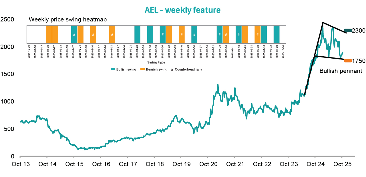 Comment | A developing falling wedge persists above the 200-day SMA, though fading upside momentum poses concern. We retain a profit target of R227.00, with a trailing stop at R169.00. | A low-volatility phase suggesting market stability and accumulation remains notable. The price stays above the 200-day SMA, with fading downside momentum supporting the trade. We maintain a profit target of R157.00 with a trailing stop at R128.00. | The price remains within an upward-sloping regression channel but below the 200-day SMA, framing this as a counter-trend trade. Fading downside momentum supports the setup. We maintain a profit target of R1 255.00 and a trailing stop at R944.00. |