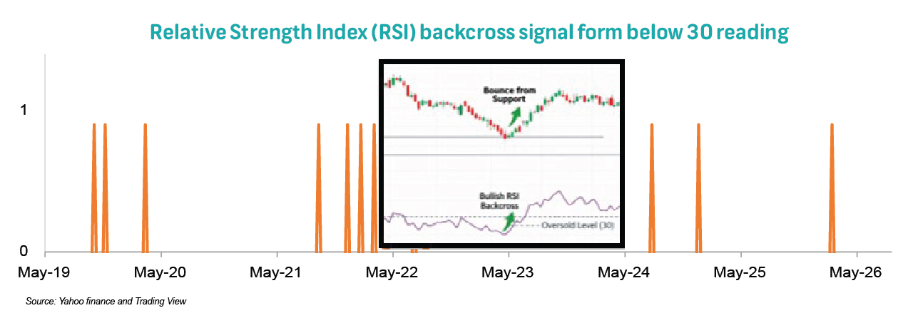 • The lower panel reflects occurrences of Relative Strength Index (RSI) backcross signals from oversold territory. This is considered a bullish signal, as it indicates that selling pressure has likely been exhausted and that momentum is beginning to shift back to the upside.