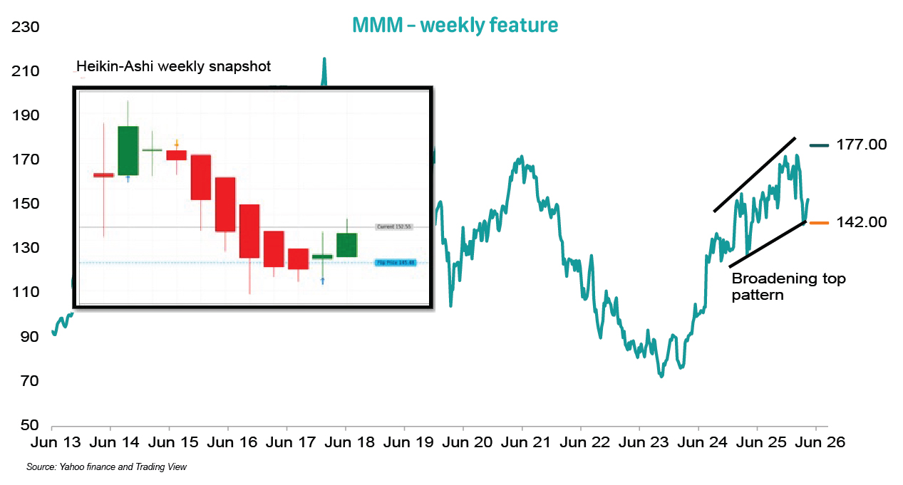 Technically, the price testing the lower range of an upsloping broadening-top pattern presents an attractive buying opportunity (see the black diverging trendlines on the main chart). This pattern reflects 3M's recent price movement which has transitioned from a period of steady recovery into a more balanced consolidated phase. A breach of the upper boundary could act as a launchpad for a stronger upward movement, supporting the bullish stance.